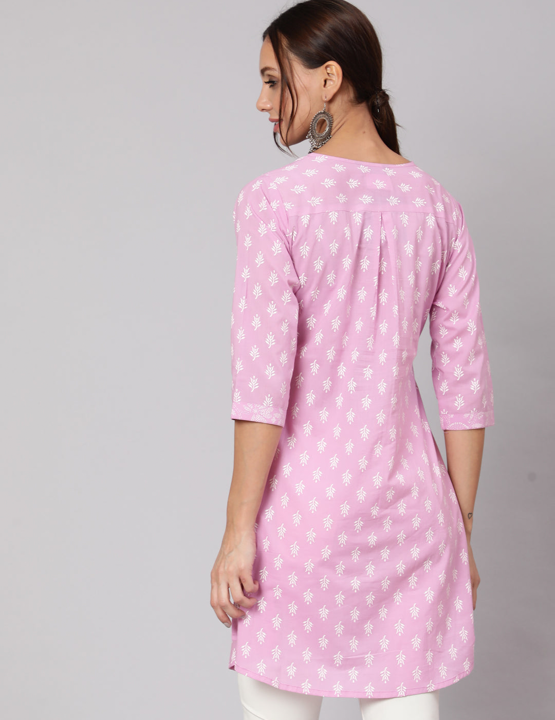 Description: Elevate your style with this pink-purple kurti featuring a delicate floral print all over. It's perfect for both casual and semi-formal occasions, offering comfort and a cooling effect.