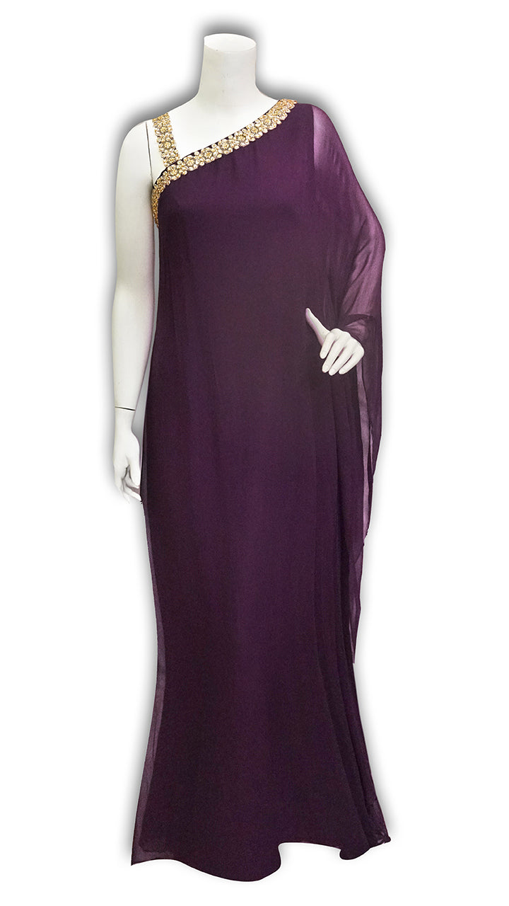 Wine floor length off shoulder kaftan style dress from Studio J. Crafted in premium quality georgette fabric, it has light embellishments around the neck. Style this gown with statement earrings and complete the look with your high heel.